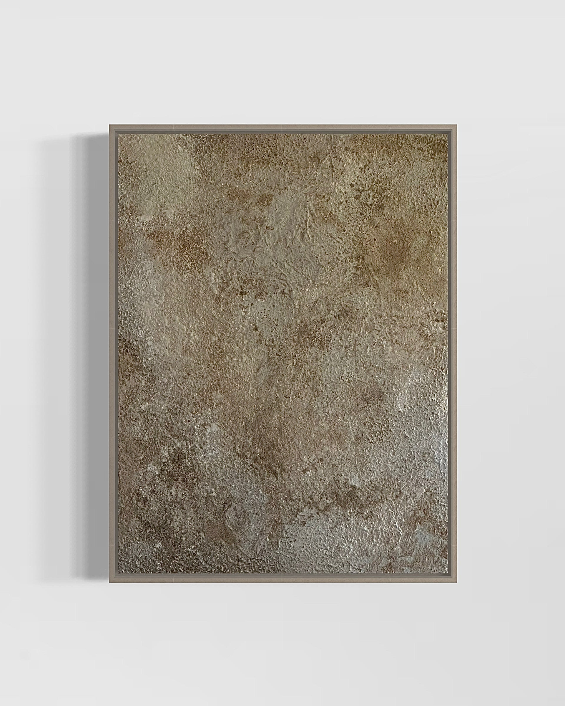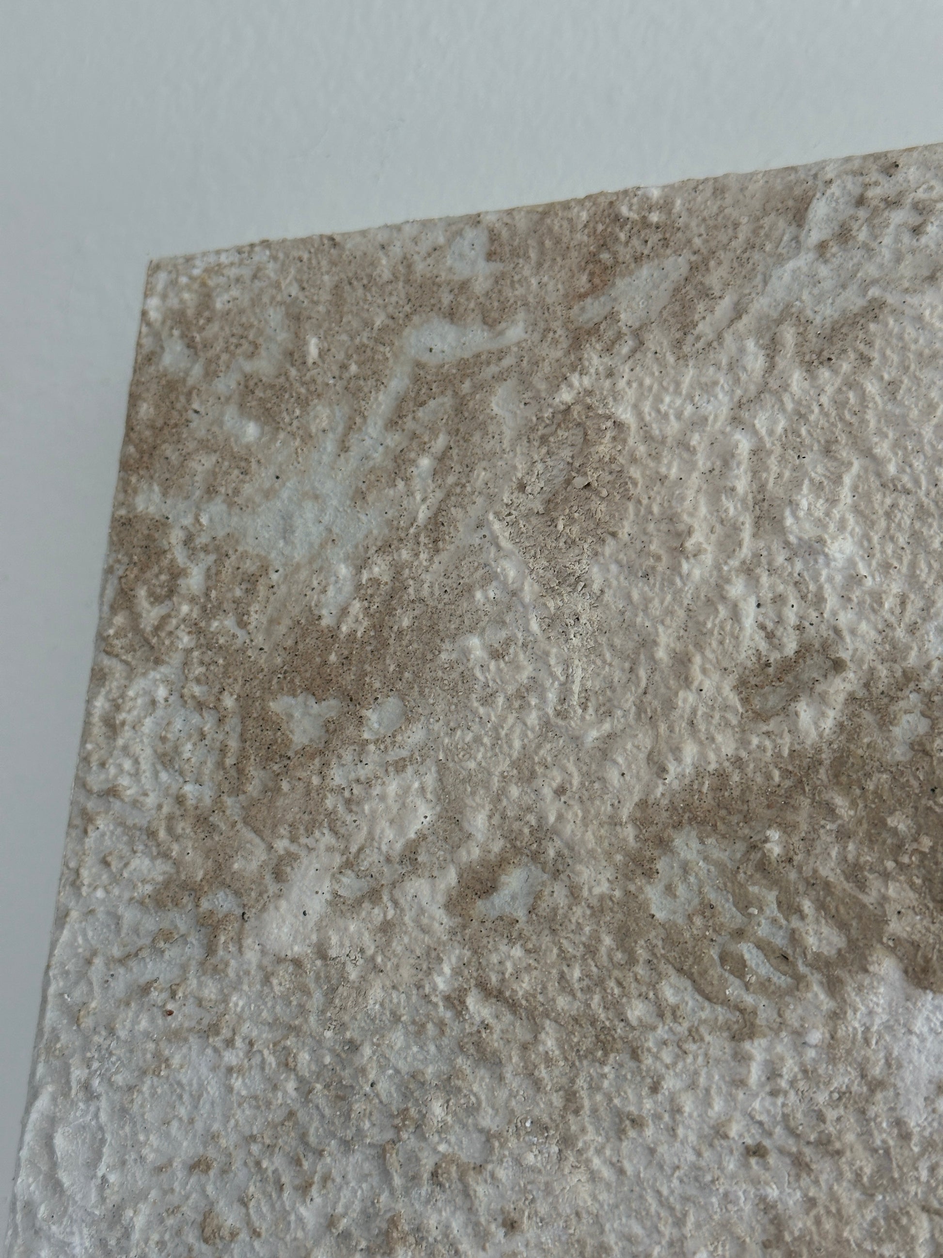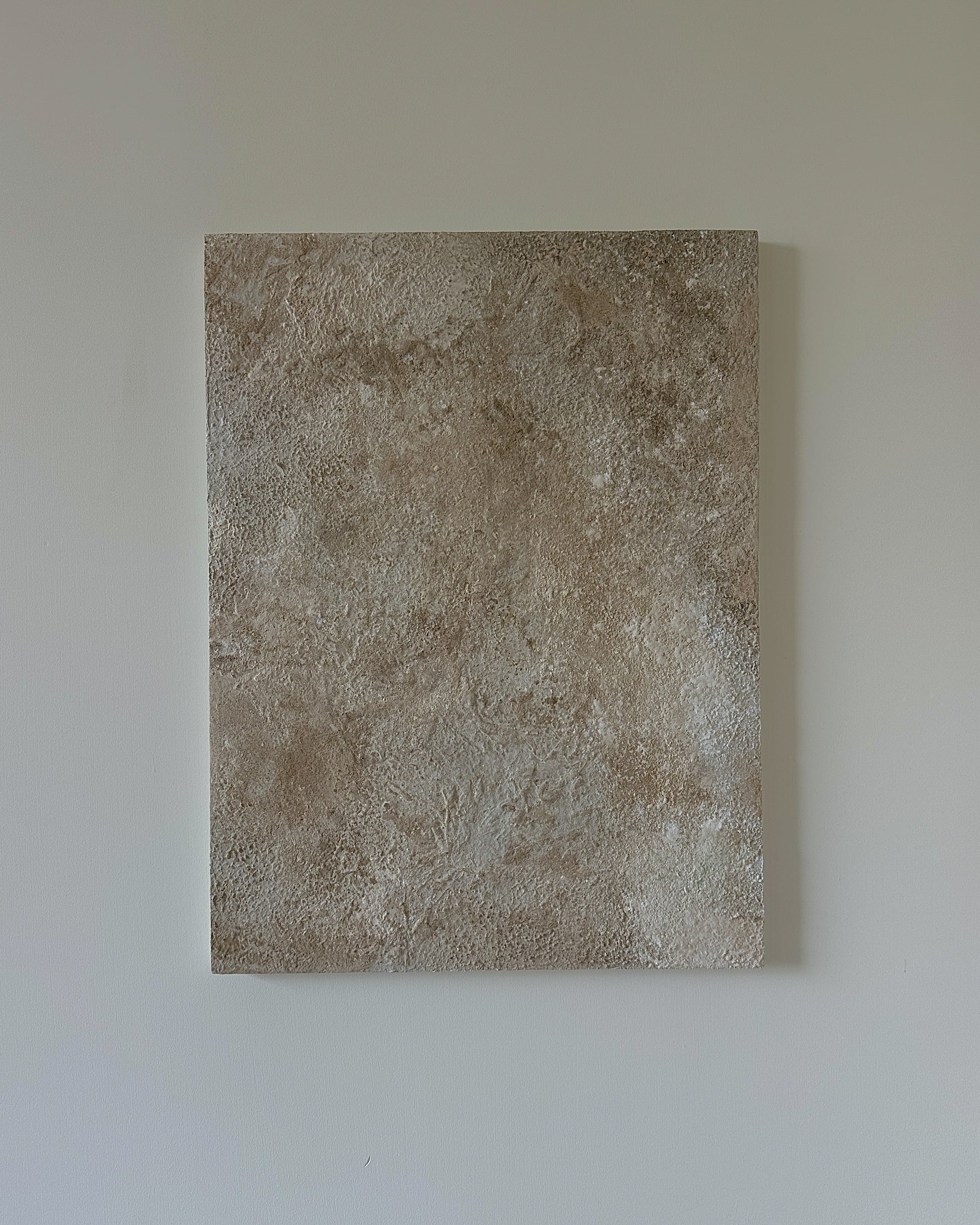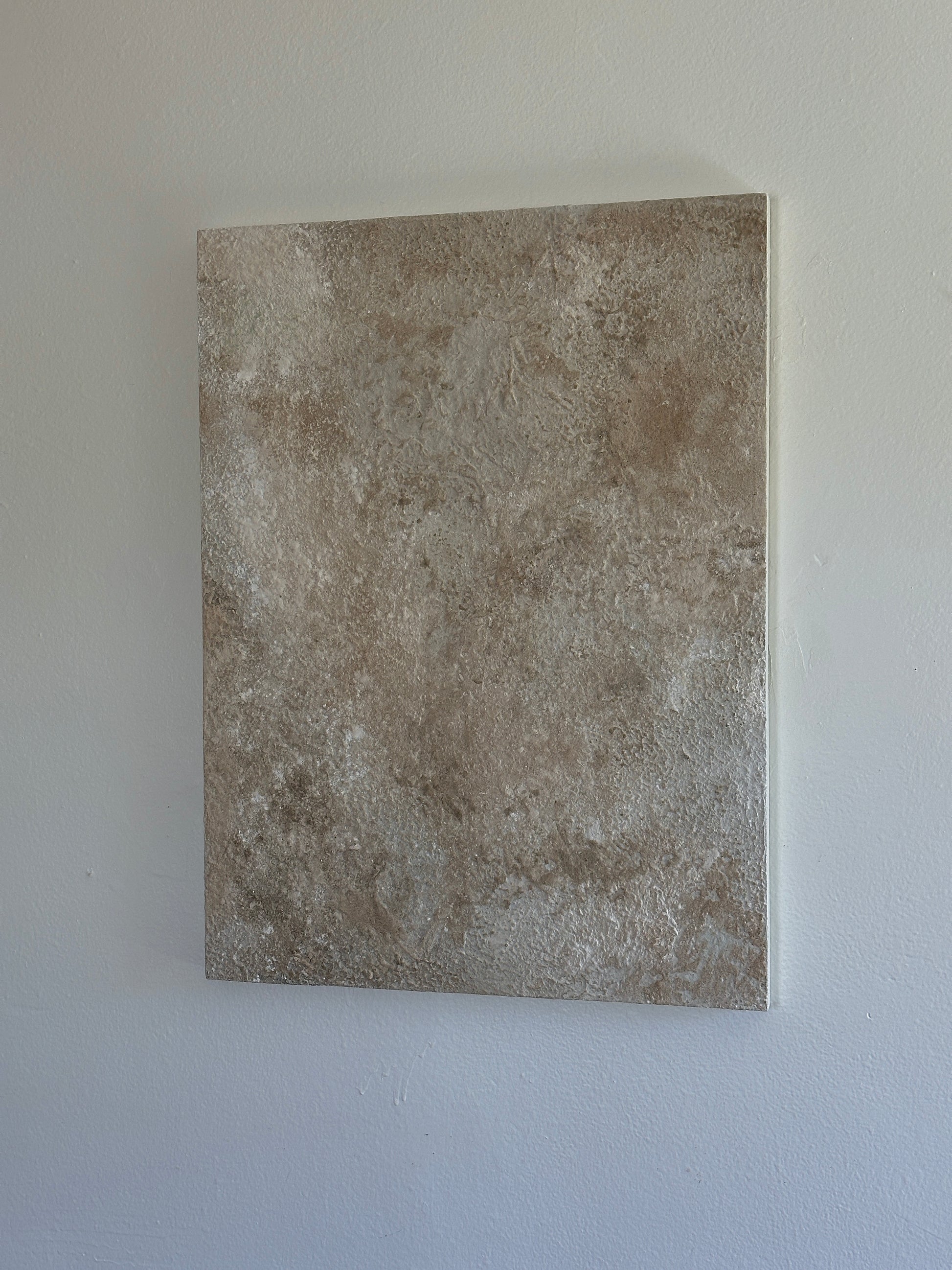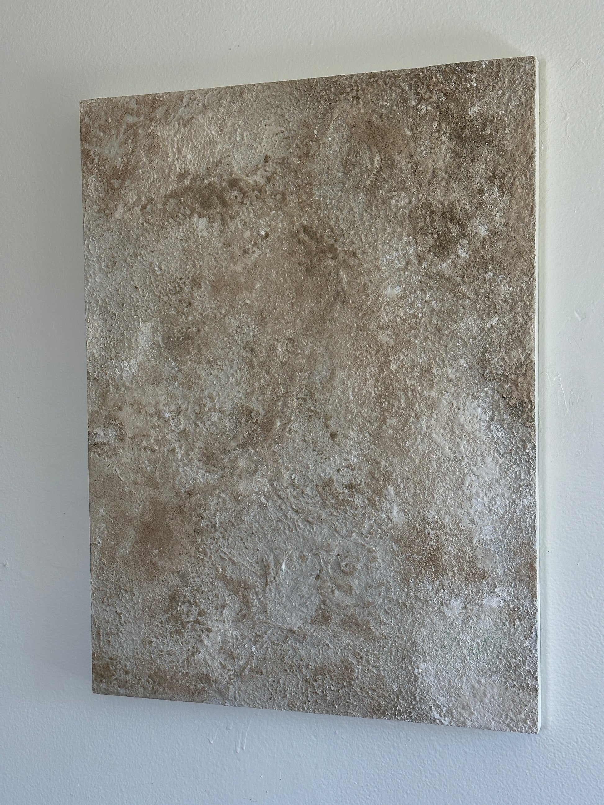 A tactile meditation on groundedness and transcendence, this piece was created with foraged earth materials—locally gathered pigments, clay, and minerals—applied in layers to evoke a richly textured surface. Though composed entirely from elements of the land, the result feels celestial, reminiscent of a lunar terrain or imagined planetary landscape.