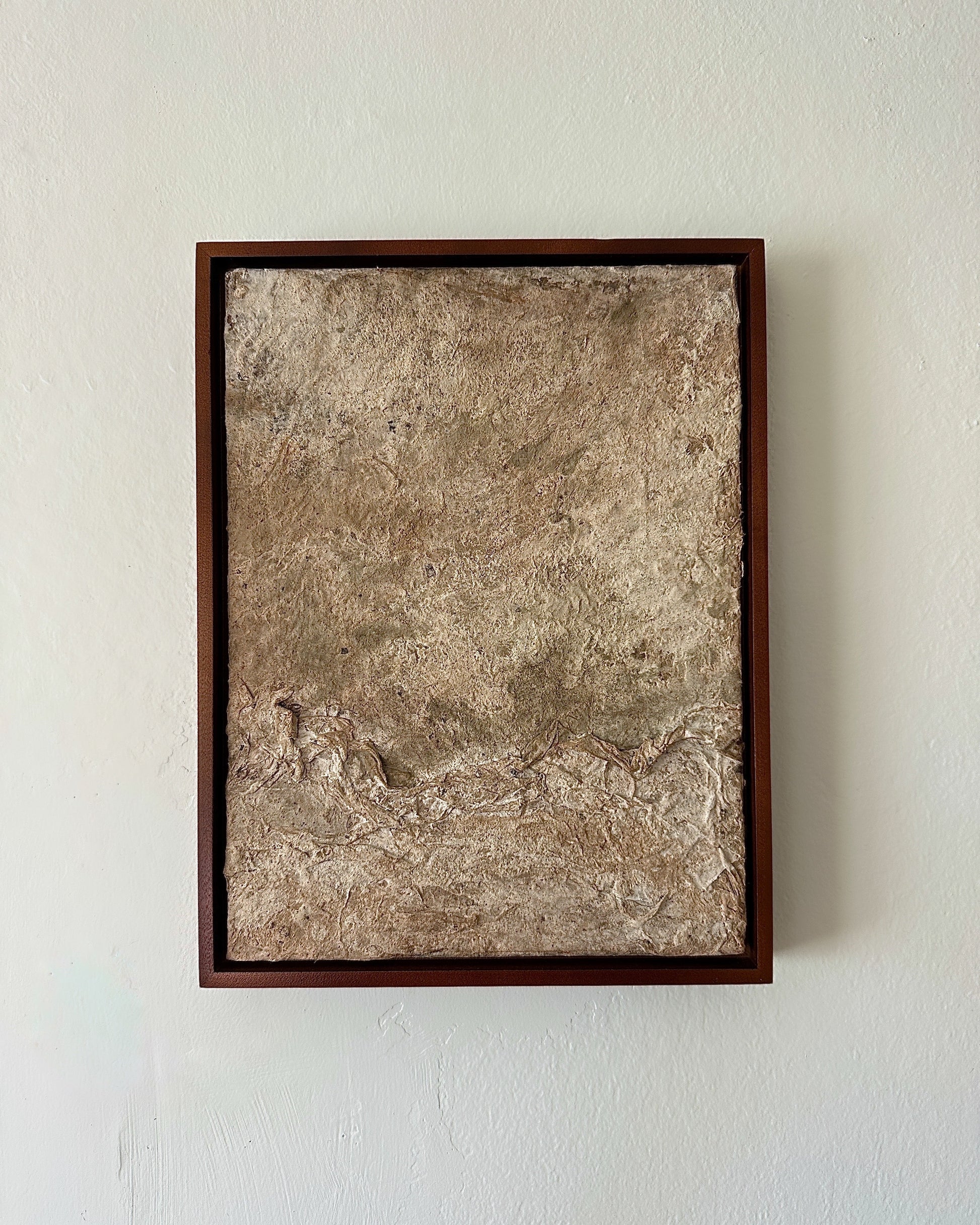 Framed in solid walnut, this eco-friendly wall decor bridges painting and sculpture, making it ideal for wabi sabi, Japandi, rustic, French country, mid-century modern, and contemporary interiors. Perfect for collectors and interior designers seeking sustainable wall art, organic modern wall sculptures, natural material artwork, and unique handmade decor inspired by California landscapes and topography.