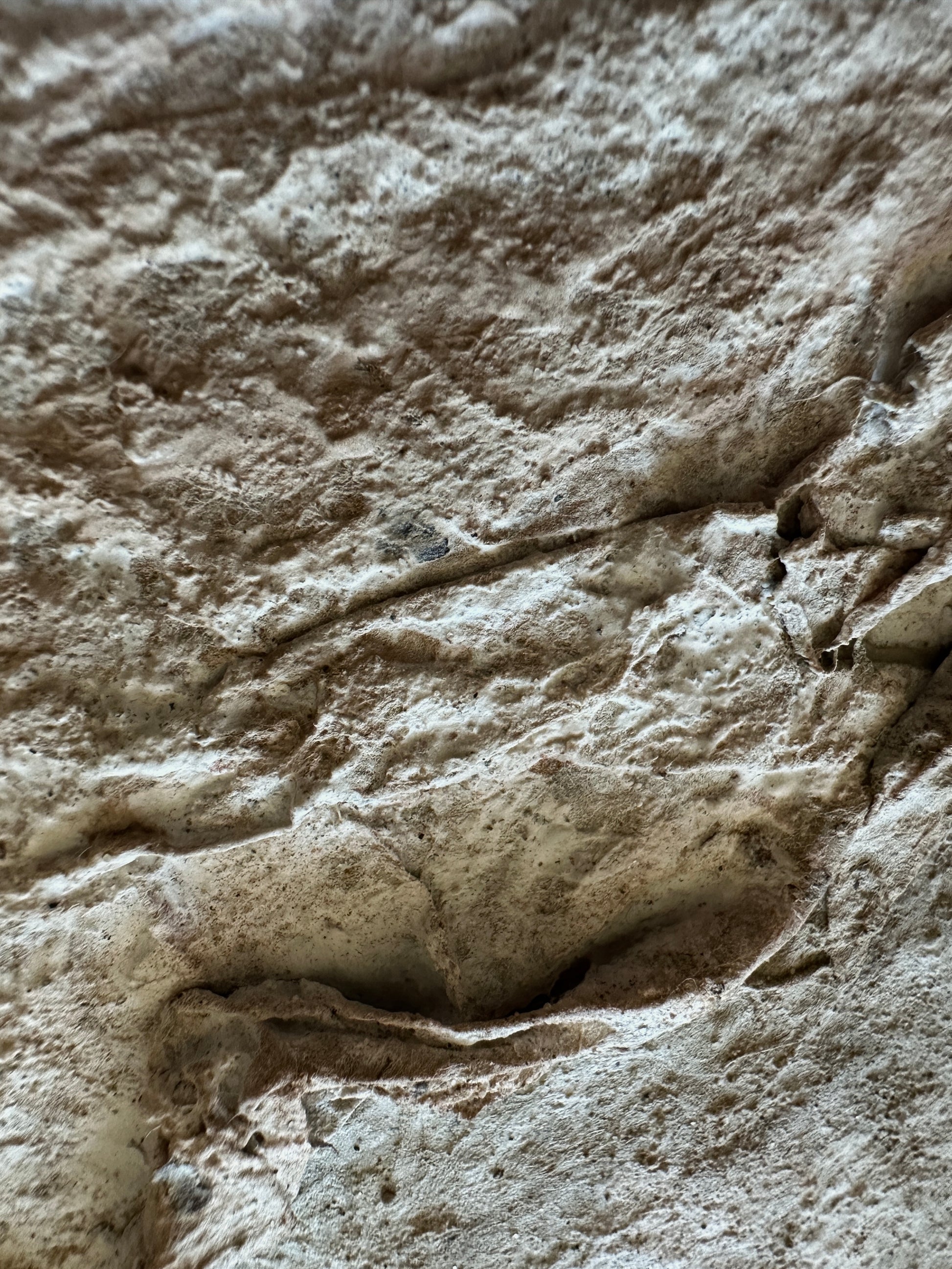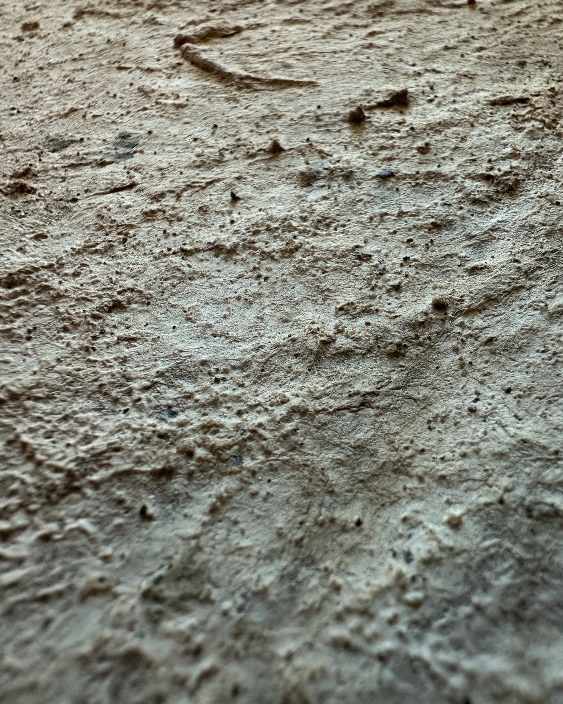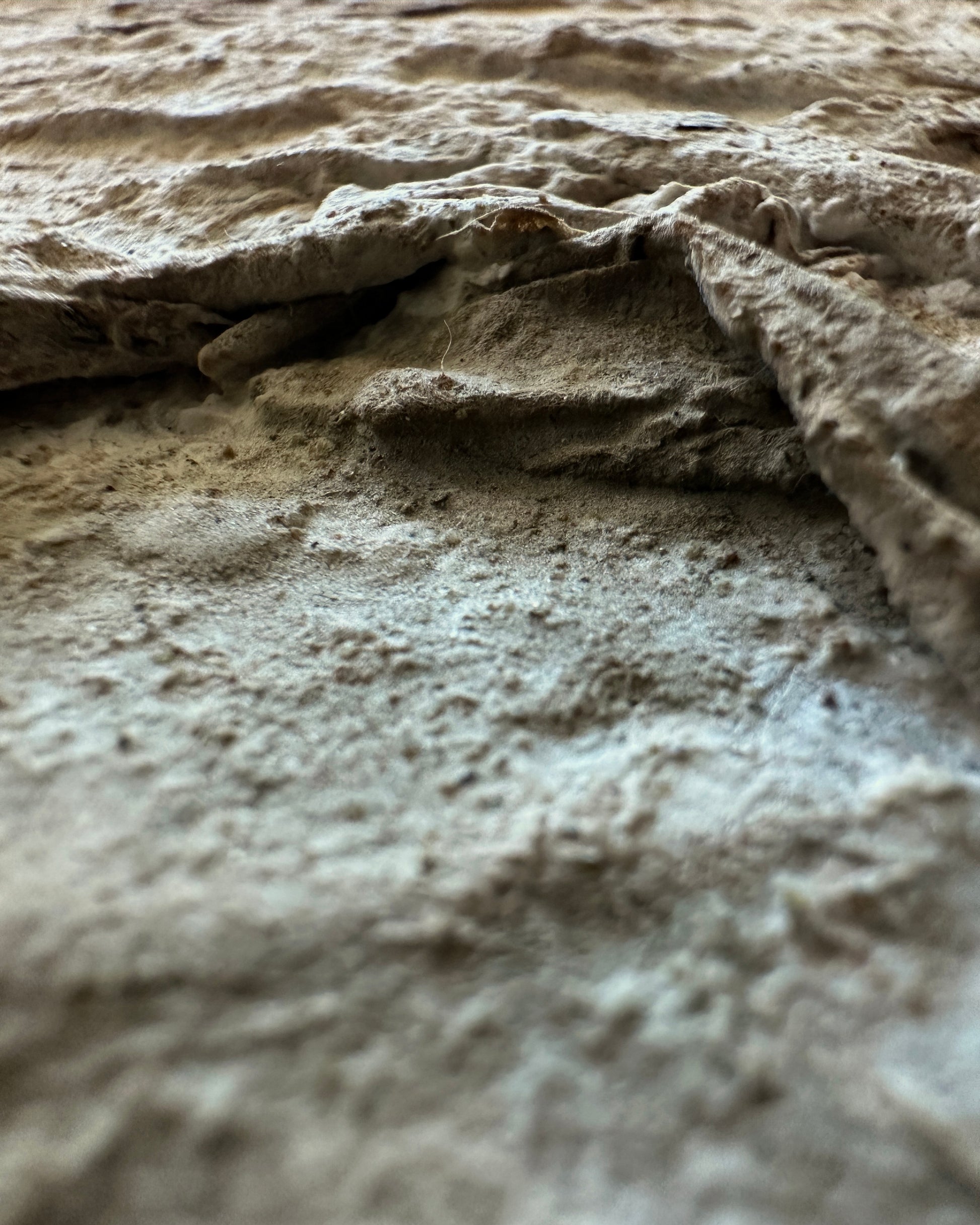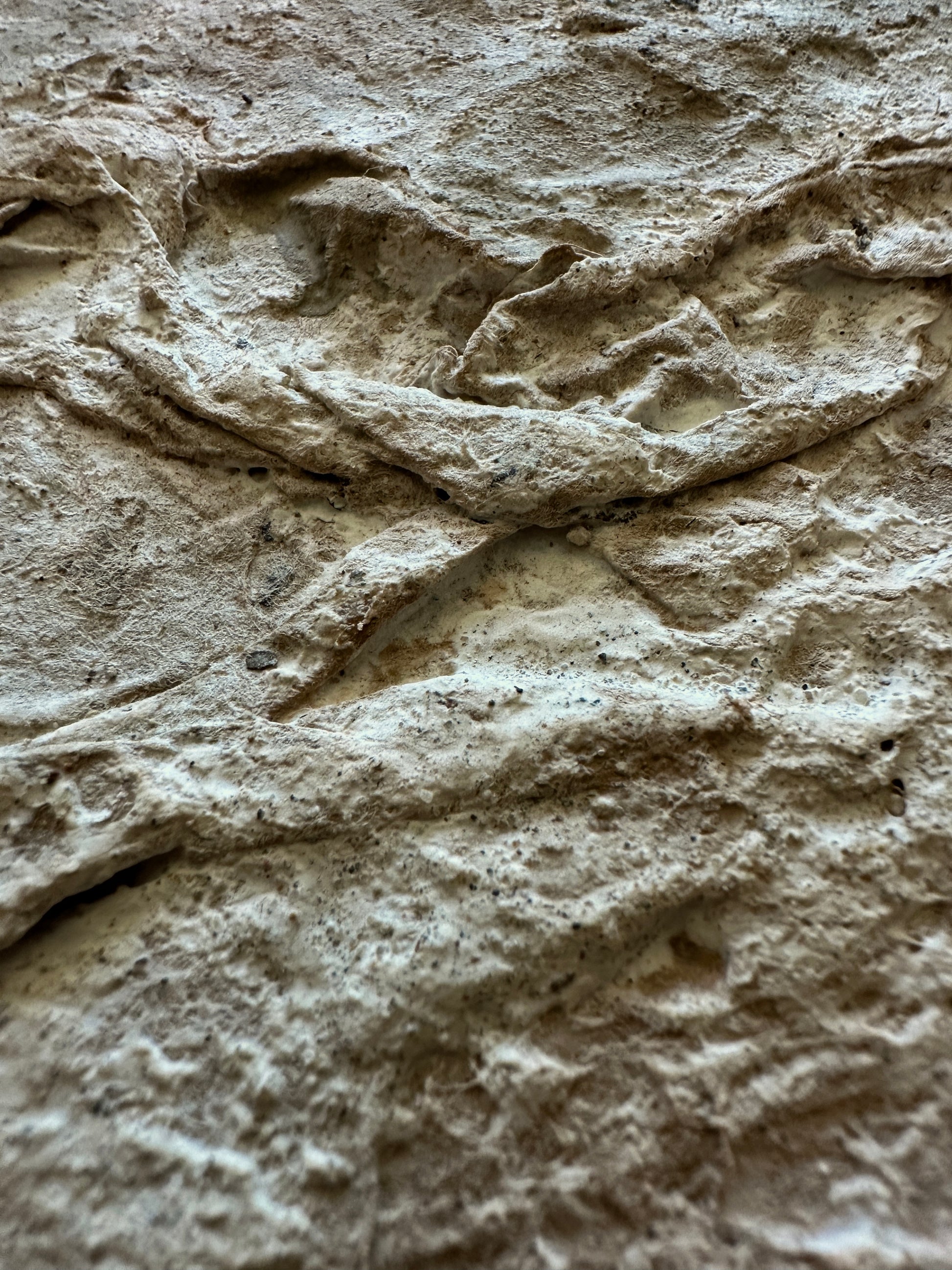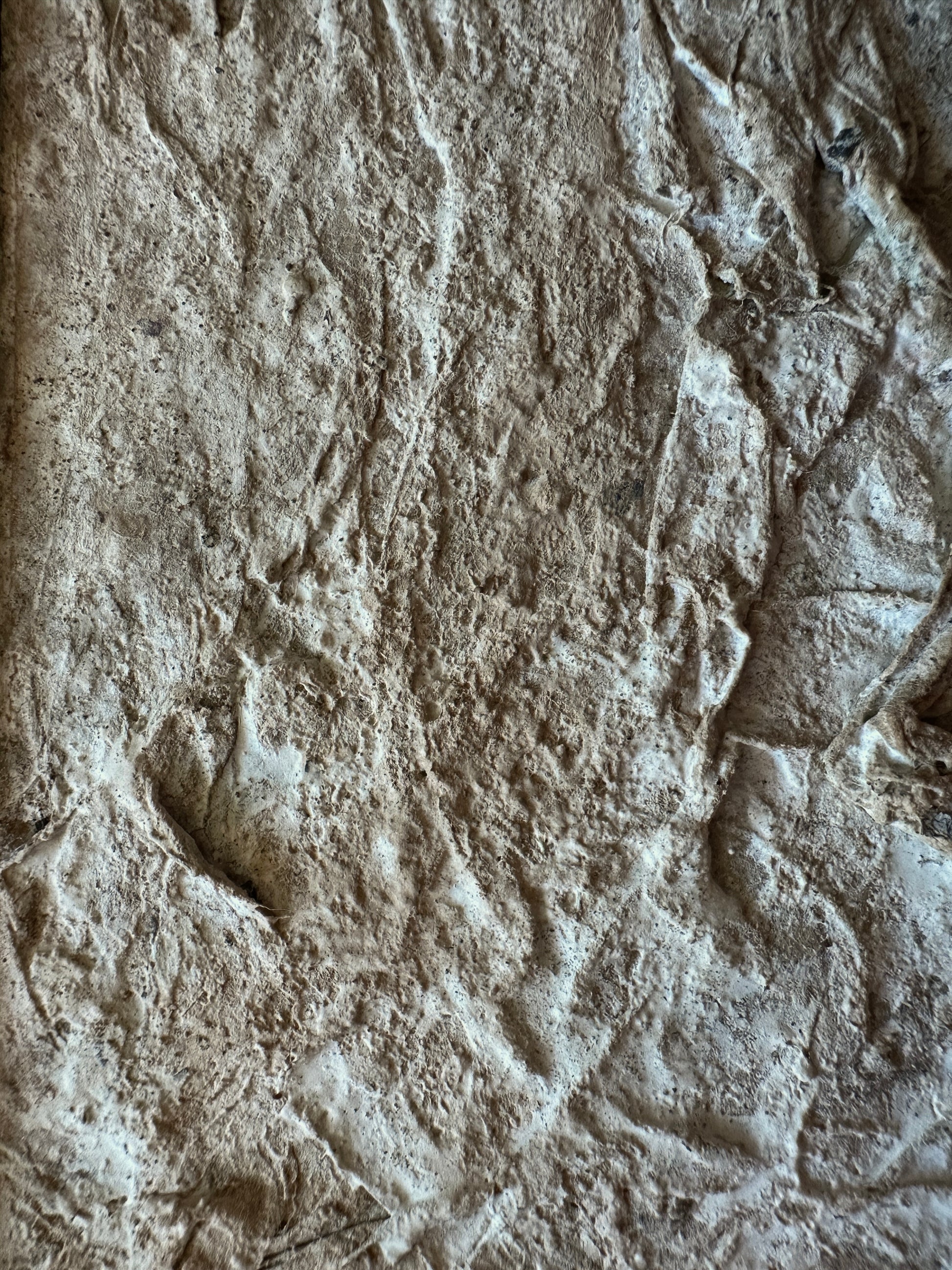 Across the tactile surface, subtle shifts in elevation and depth trace an imagined topography—peaks and valleys emerging through layers of organic matter. The work invites both close inspection and distant viewing: from afar, the composition settles into a quiet unity; up close, it reveals a complex network of fissures, ridges, and folds.